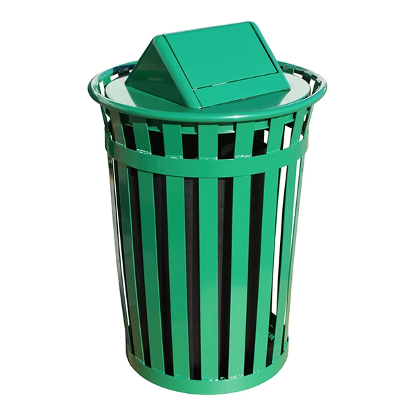 Our 36 Gallon Slatted Trash Can is a great addition to parks, public gardens, cityscapes, apartments, and municipalities. A simple timeless design created by steel slatts and powder-coated black, brown, green, or silver to blend into its environment. A metal banding at the top adds extra strength and breaks up the design. The glossy finish prevents graffiti from adhering to its surface and resists fading as well. The swing top ensures easy access while preventing water from getting into the liner. With built-in leveling feet, secure placement on uneven surfaces is provided. Each unit includes an anchor kit at no additional charge. Made with locally sourced material and built in the USA.