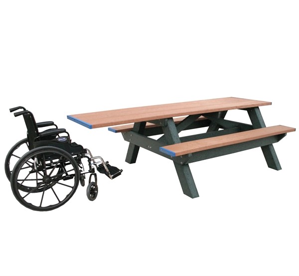 The standard Handicap picnic table has the traditional step over design using solid 2x10 100% recycled plastic lumber for the tops and seats and heavy-duty solid plastic 4x6 lumber for legs. The seats and table top are trimmed on one end with end caps matching the frame color while the other end is trimmed with blue end caps indicating ADA universal access. The overhang provides accessibility for one wheelchair to sit comfortably at the table. The recycled plastic is maintenance free and impervious to weather and insects. The molded in color of the plastic lumber in this traditional design makes this table attractive in any setting. This product ships partially assembled with detailed instructions for the remaining assembly required using standard hand tools. Please note that standard tables are manufactured without an umbrella hold which is optional and can be added for a slight additional cost. Optional anchor kits to secure the table to the ground are also available.