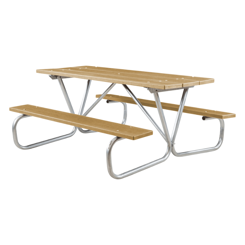 This 8 foot Rectangular Recycled Plastic Picnic Tables 'BG' model has attractively designed wall thru legs formed from strong 1 5/8 inch O.D. galvanized high strength tube. The extra wide base design gives added tip resistance for patron safety. Cross braces are 1 5/16 inch O.D. galvanized tube. Tops and seats are recycled plastic reinforced with steel ribs for years of durability. Lightweight design and portable for convenience.
