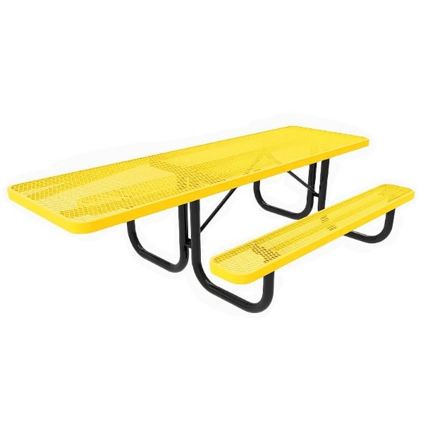 This RHINO commercial picnic table is made with an 8 foot extended tabletop with 6 foot seats for wheelchair access. Made of the toughest materials the industry has to offer, the RHINO picnic tables are made of US-sourced steel and polyolefin thermoplastic. Choose from 3/4" expanded metal or 1/2" perforated metal with a thick thermoplastic coating and 2-3/8" powder coated frame for strength and durability. Features flat steel inside bracing and 1" diagonal braces for support. The thick coating features a smooth glossy finish that is vandal-resistant and mildew resistant. Our Universal Access picnic tables are ADA compliant to accommodate all of your guests.